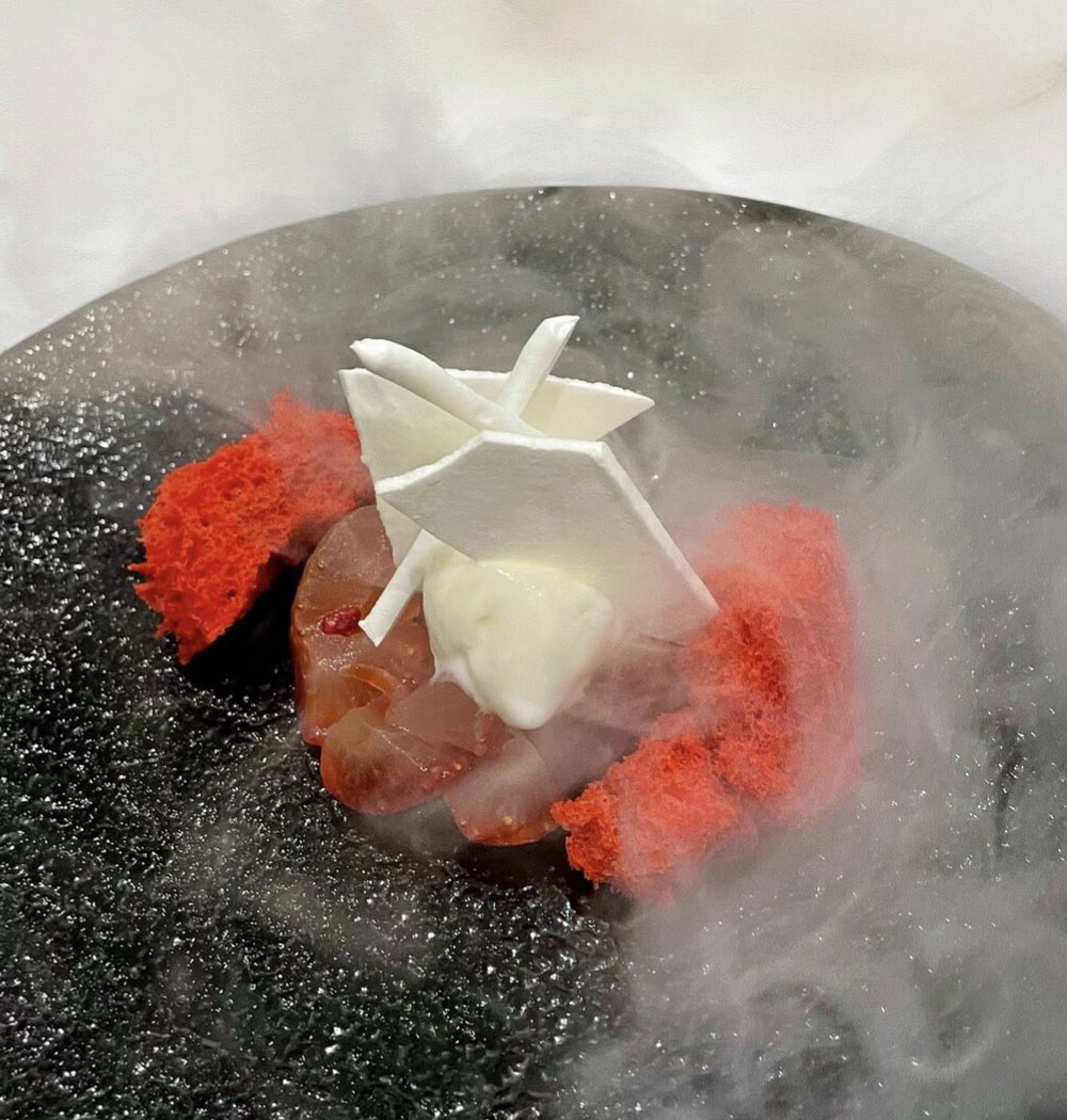 まずはフランスとスペインにまたがり、独自の文化を持つバスク地方の食についてのセミナーからスタート。当協会の山本益博理事、石塚奈帆美理事、本間るみ子副会長が、その食の歴史や魅力、バスクの豚肉やチーズなどの食材について語りました。その後はダイニングに場所を移し、同店磯島仁シェフによる、バスクの伝統と現代のクリエイションが融合するコースを堪能。参加者はひとときの食の旅を楽しみました。