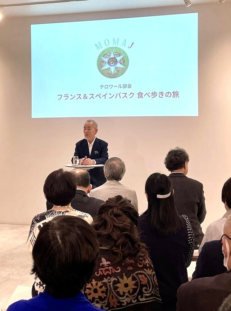 まずはフランスとスペインにまたがり、独自の文化を持つバスク地方の食についてのセミナーからスタート。当協会の山本益博理事、石塚奈帆美理事、本間るみ子副会長が、その食の歴史や魅力、バスクの豚肉やチーズなどの食材について語りました。その後はダイニングに場所を移し、同店磯島仁シェフによる、バスクの伝統と現代のクリエイションが融合するコースを堪能。参加者はひとときの食の旅を楽しみました。